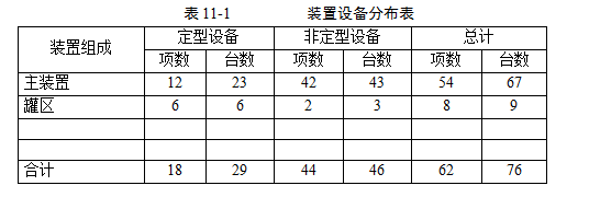 本裝置共有工藝設(shè)備76臺(tái),其中定型設(shè)備28臺(tái),非定型設(shè)備48臺(tái),詳見(jiàn)表11-1。