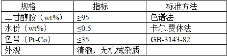 產(chǎn)品二甘醇胺質(zhì)量可以達到世界先進水平產(chǎn)品標(biāo)準(zhǔn),本技術(shù)可實現(xiàn)的產(chǎn)品質(zhì)量規(guī)格如表1。