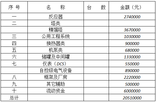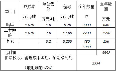 綜上所述,年產(chǎn)3000噸嗎啉、2200噸二甘醇胺裝置固定總投資約為2050萬元,其中固定資產(chǎn)投資約1450萬元,流動資金600萬元。