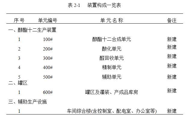 本項目裝置組成包括醇酯十二合成單元、精制單元及輔助生產設施等部分。