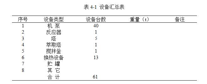 本項目生產裝置工藝設備共61臺(套)。各類型設備見設備匯總表4-1。